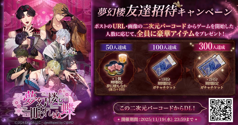 キャンペーンポストに掲載のURL&画像のQRコードからゲームを開始した人数に応じて、全員に豪華アイテムをプレゼント!